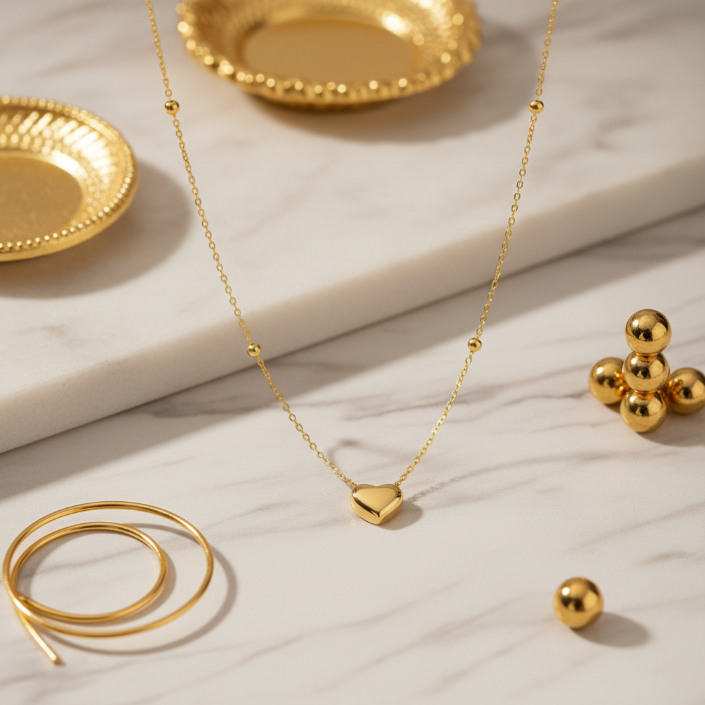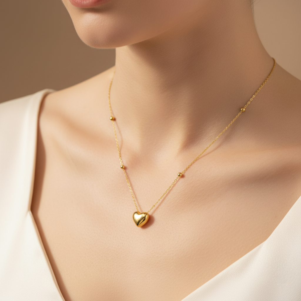 Ce collier raffiné en acier inoxydable plaqué or 18K révèle un pendentif cœur lumineux, suspendu à une chaîne délicatement ornée de perles dorées.