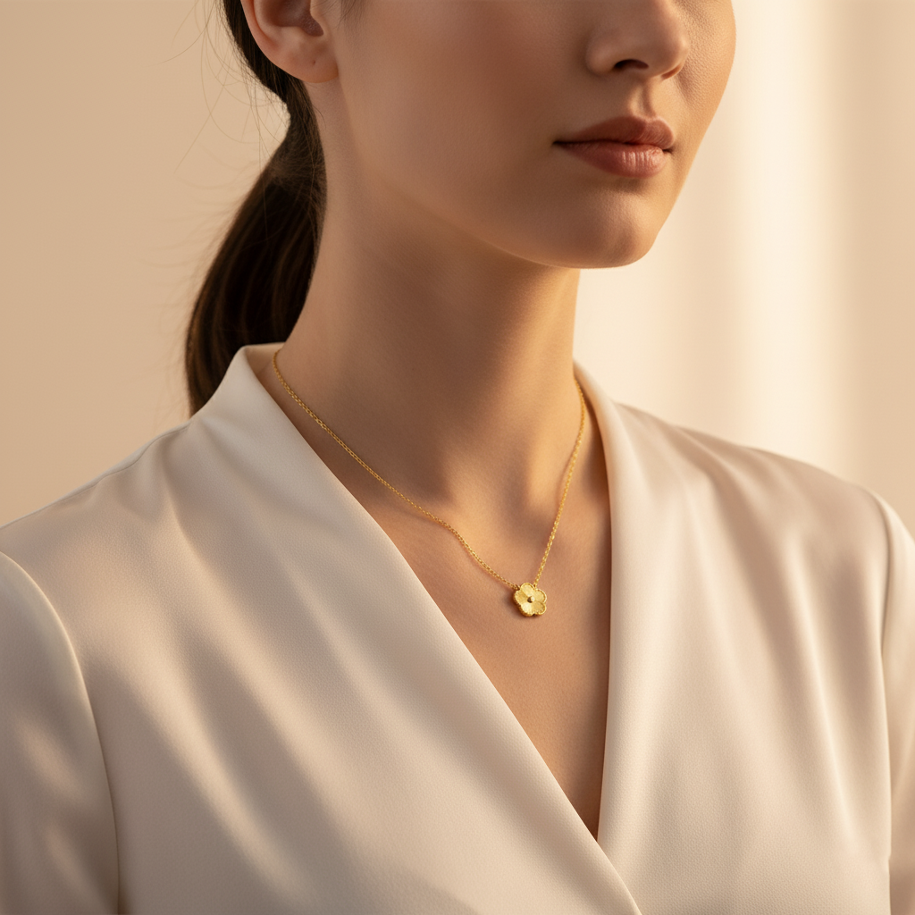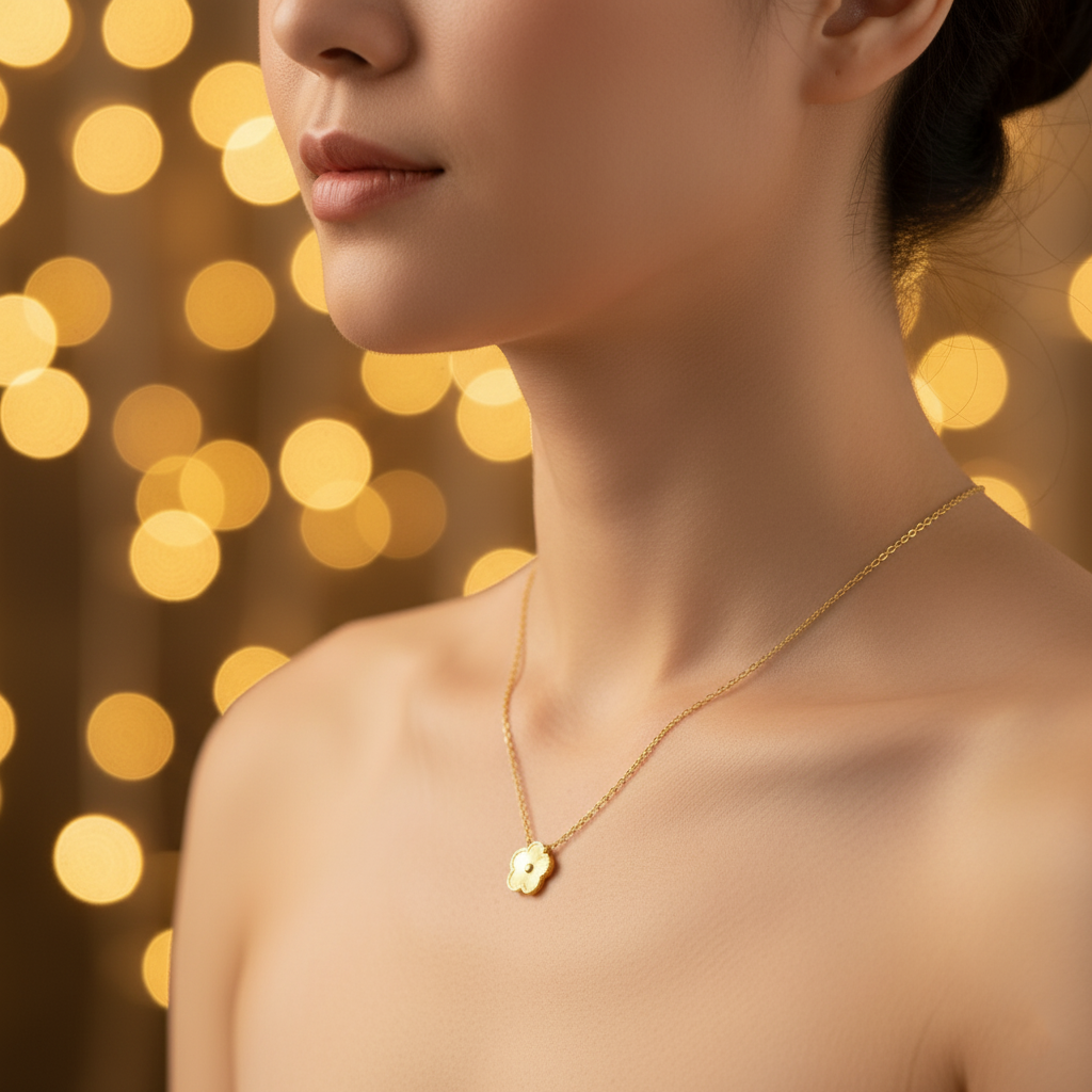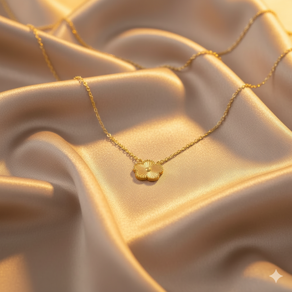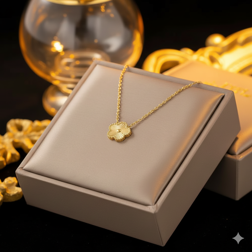 Réalisé en acier inoxydable plaqué or 18K, ce collier révèle une fleur lumineuse aux détails raffinés, symbole d’élégance et de féminité intemporelle.