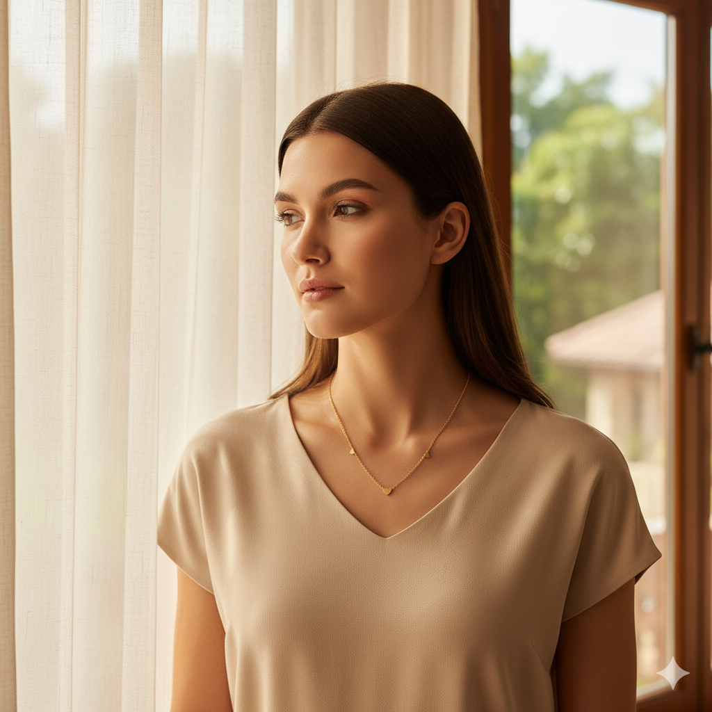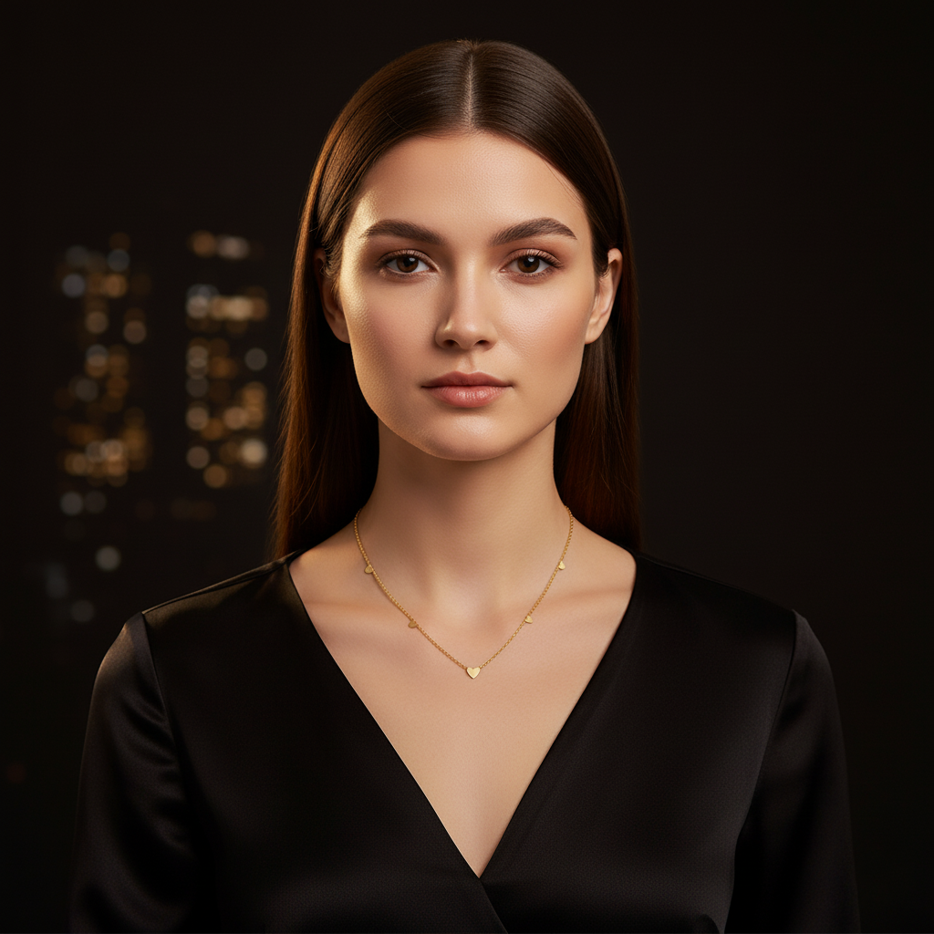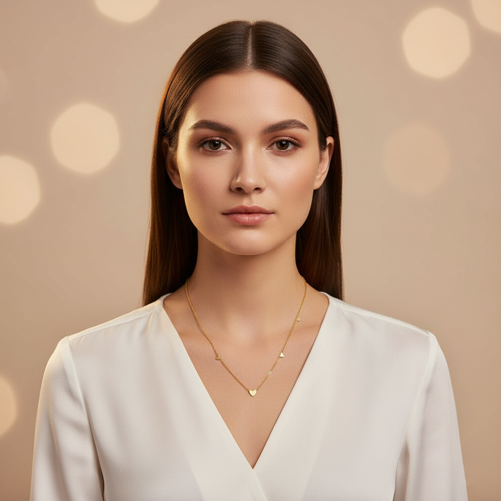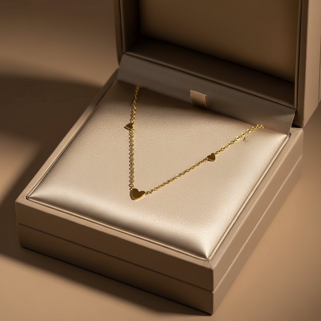 Ce collier raffiné en acier inoxydable plaqué or 18K est orné de délicats pendentifs en forme de cœurs, sublimant la chaîne d’un éclat subtil.